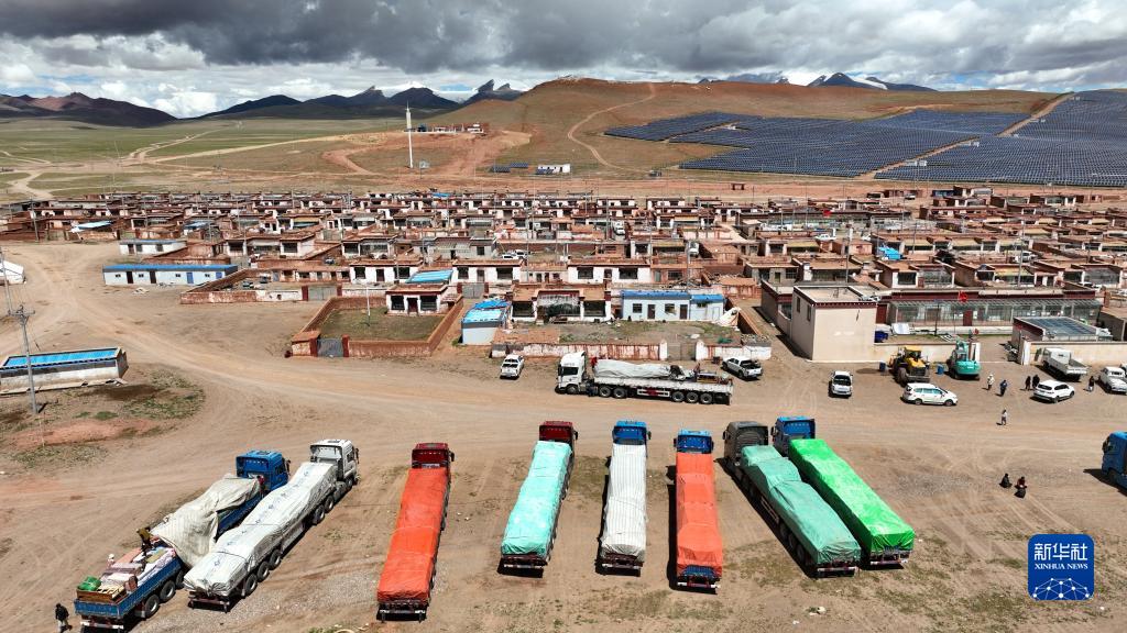 運輸家具的貨車在雙湖縣多瑪鄉果根擦曲村集合(7月12日攝,無人機照片)。新華社記者 晉美多吉 攝