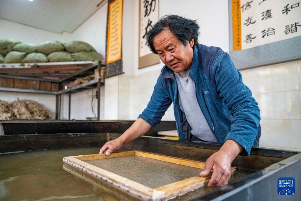 在西藏米林市羌納鄉西嘎門巴村,南迦巴瓦童螺嘎布工藝品農民專業合作社的工作人員正在制作藏紙(7月26日攝)。新華社記者 孫非 攝