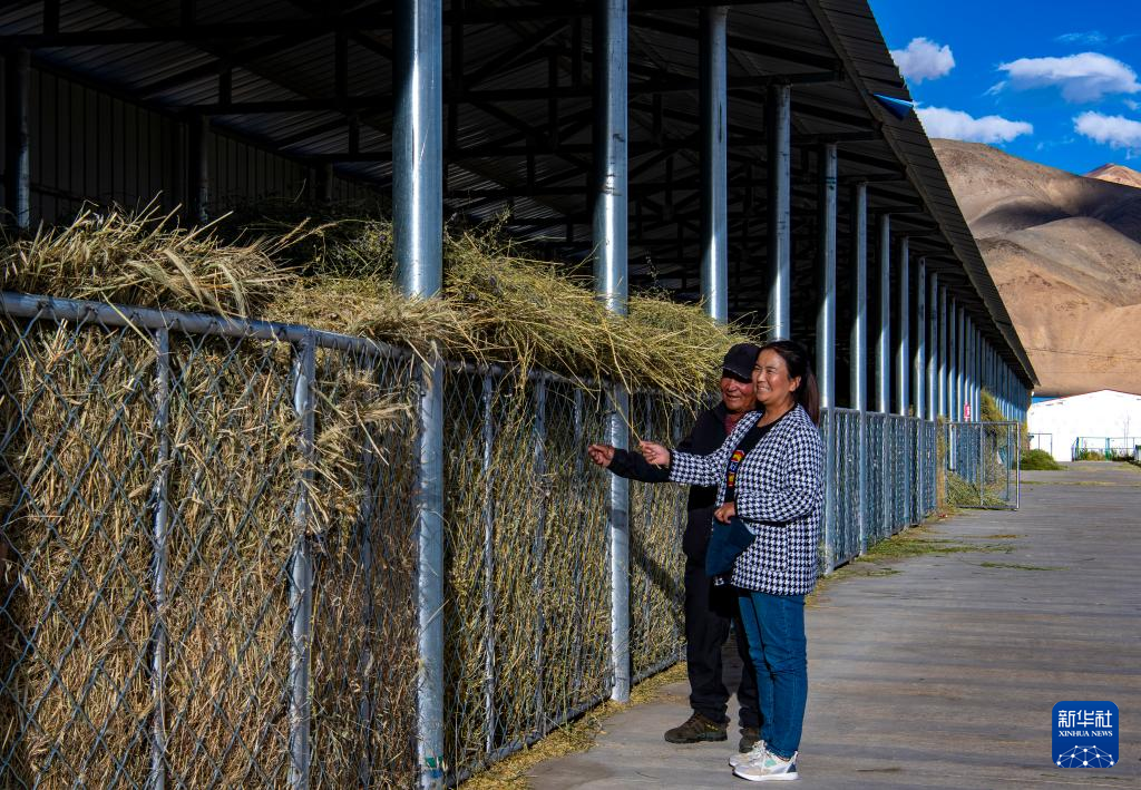 阿里地區噶爾縣昆莎鄉噶爾新村村民白瑪努桑(左)與地區農業農村局草業工作站工作人員巴桑多吉在查看草棚里晾曬好的紫花苜蓿(9月20日攝)。新華社記者 姜帆 攝