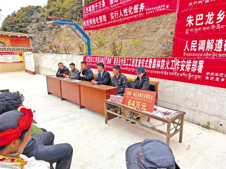 圖為發放農牧民群眾工資現場。記者 索朗旺久 攝