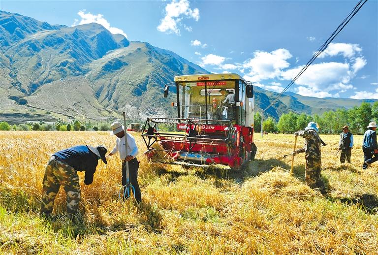 圖為拉薩市達孜區塔杰鄉巴嘎雪村村民使用大型機械進行收割。記者 旦增蘭澤 攝
