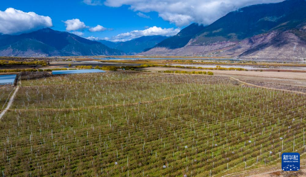鳥(niǎo)瞰米林市羌納鄉(xiāng)西藏林芝現(xiàn)代蘋(píng)果標(biāo)準(zhǔn)化園區(qū)(無(wú)人機(jī)照片,11月13日攝)。新華社記者 姜帆 攝