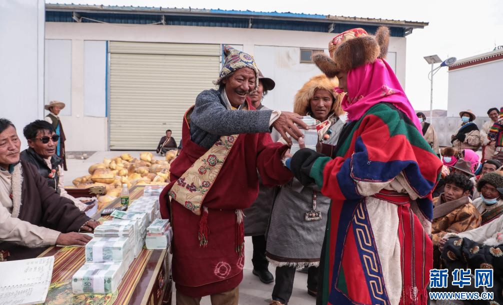 合作社為社員發放現金分紅(11月28日攝)。新華社發(索朗仁青 攝)