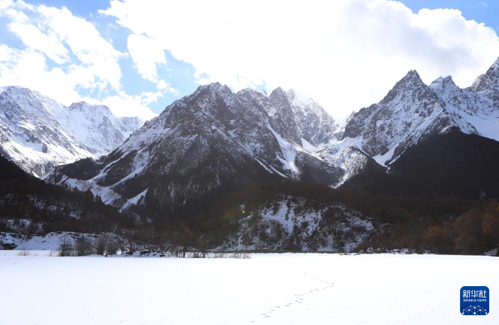 梅里雪山群峰和覆蓋白雪的冰湖(1月5日攝)。新華社記者關明輝 攝