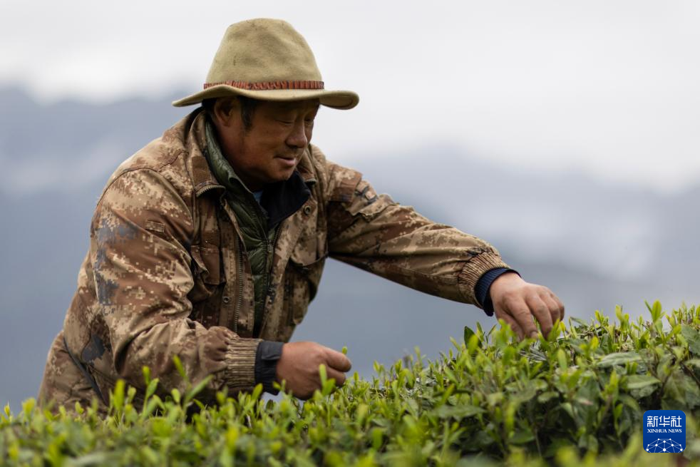 墨脫縣背崩鄉格林村村民登巴扎巴在茶園中采茶(4月24日攝)。新華社記者 姜帆 攝