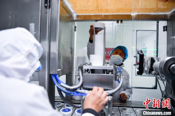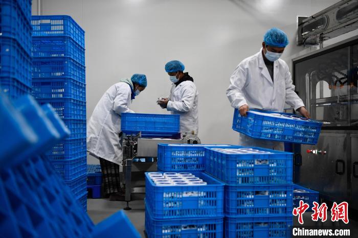 10月25日,西藏自治區那曲市聶榮縣,畜產品深加工產業正成為帶動牧民增收致富的新引擎。圖為嘎確生態畜牧業發展有限責任公司的工人在酸奶生產流水線上工作。中新社記者 貢嘎來松 攝