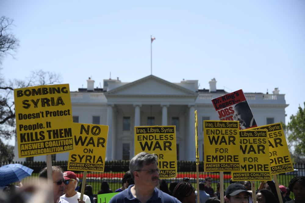 2018年4月14日,在美國華盛頓白宮北側,人們手持標語抗議對敘利亞進行軍事打擊。新華社記者楊承霖攝