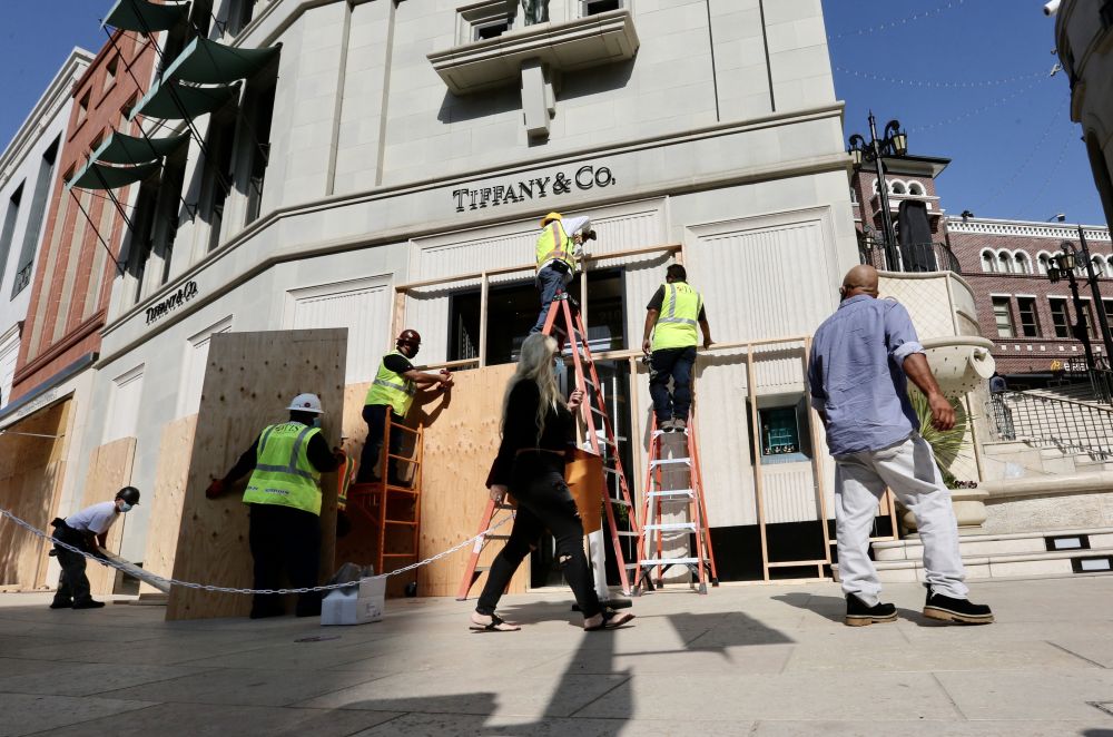 2020年11月2日,美國洛杉磯縣貝弗利山市商業區的商家將店鋪門窗封上。為應對當時美國大選可能出現的抗議或騷亂,貝弗利山市不少商業區加強防護和安保。 新華社發
