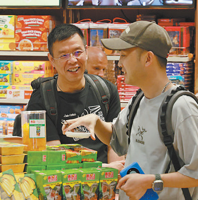 在泰國曼谷素萬那普機(jī)場免稅店,兩名中國游客正在購買當(dāng)?shù)靥厣a(chǎn)品。本報記者 白元琪攝