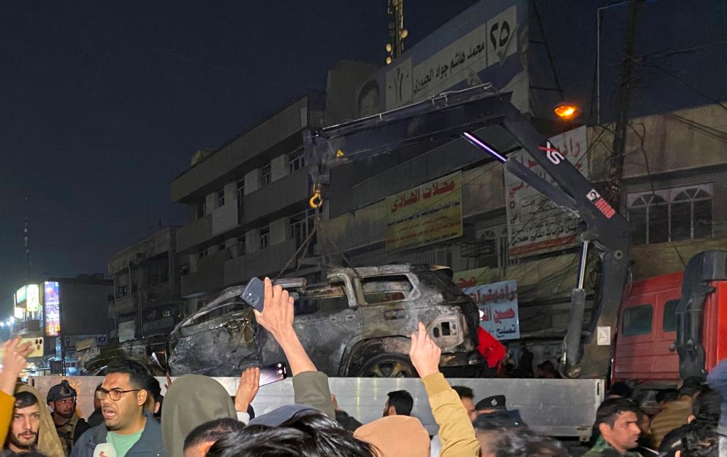 2024年2月7日,在伊拉克首都巴格達,民防部門轉移遭無人機襲擊的車輛。新華社發(哈利勒·達伍德攝)
