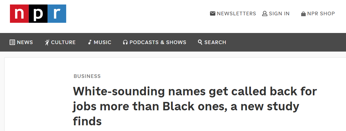據(jù)美國全國公共廣播電臺(NPR)網(wǎng)站報道,研究人員向約100家美國企業(yè)的11000個初級職位投遞了履歷相同,但個人信息(姓名、性別等)不同的83000份“偽造”簡歷。研究發(fā)現(xiàn),名字聽起來“像白人”的求職者被招聘方回復(fù)的概率更高,比名字“像黑人”的求職者平均高9.5%。在一些情況更嚴(yán)重的企業(yè),這一差距上升到約24%。