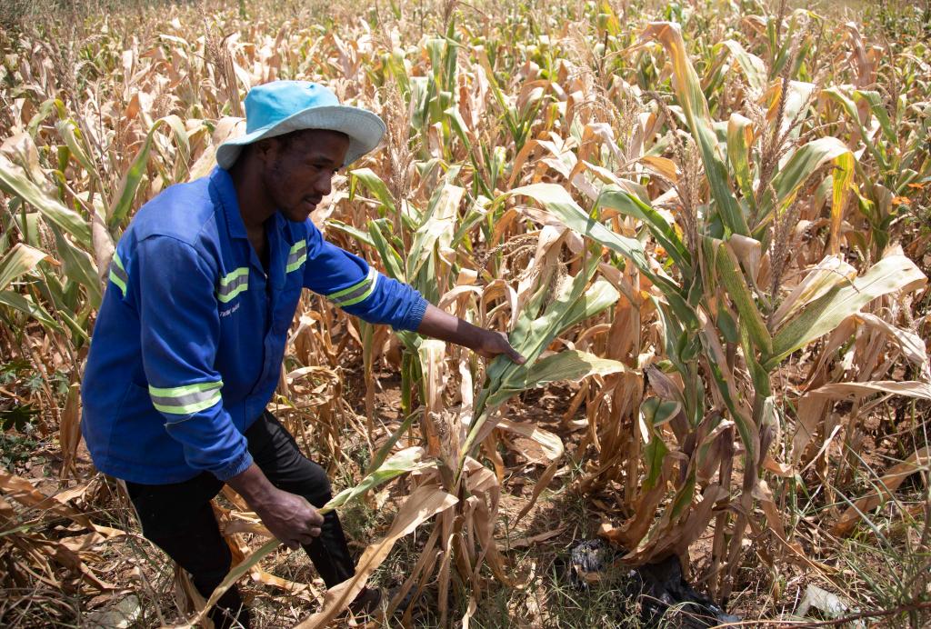 4月3日,農(nóng)民在津巴布韋首都哈拉雷近郊的一塊玉米地檢查作物長勢。津巴布韋總統(tǒng)姆南加古瓦宣布,由于厄爾尼諾現(xiàn)象造成嚴(yán)重干旱,全國進(jìn)入災(zāi)害狀態(tài)。新華社發(fā),肖恩·朱薩攝