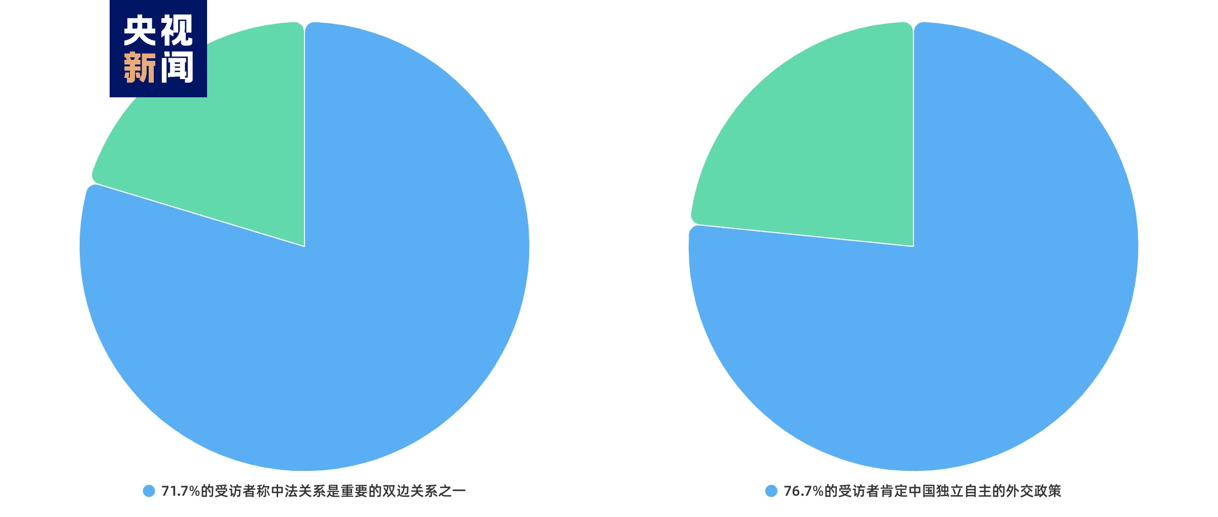 調查中,71.7%的受訪者認為中法關系是全球重要的雙邊關系之一;61.6%的受訪者對中法關系未來的發展表示樂觀,期待雙方進一步加強在經貿、科技等領域的合作;65.1%的受訪者認為,中法在國際事務上的密切合作有利于促進世界和平與發展。