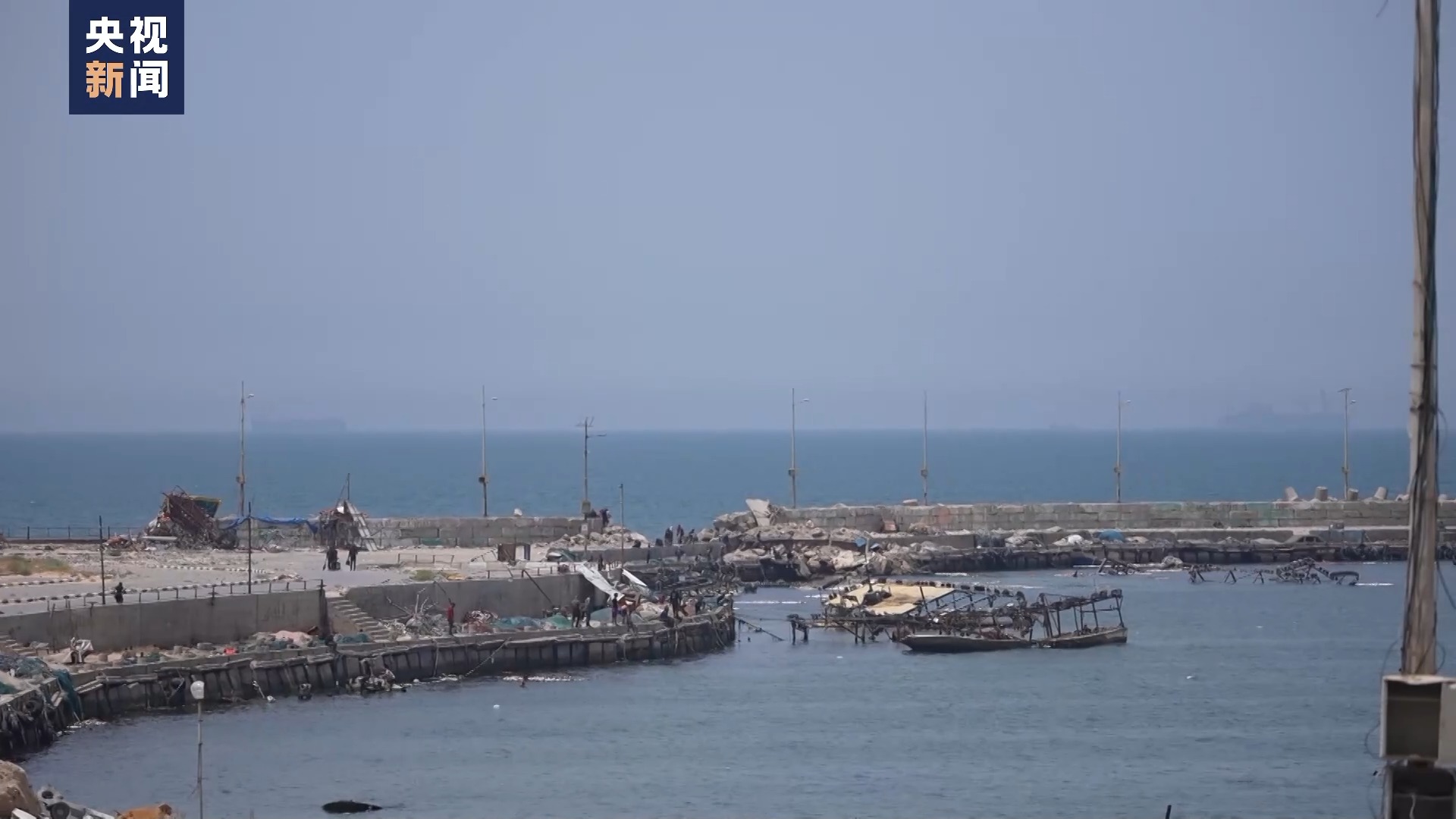 總臺報道員 奧薩馬:我們現在是在加沙城的港口附近。這是距離前往美軍浮動碼頭船只最近的地點,這個碼頭是由美國修建的,其宣稱是為了向被圍困的加沙地帶提供人道主義援助。
