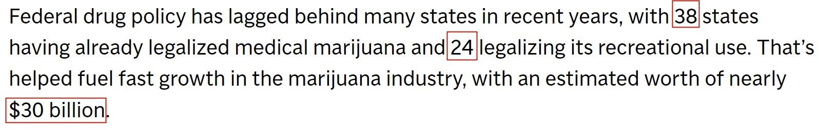 這推動了大麻產業在美國的快速發展,估計其商業及市場價值近300億美元。