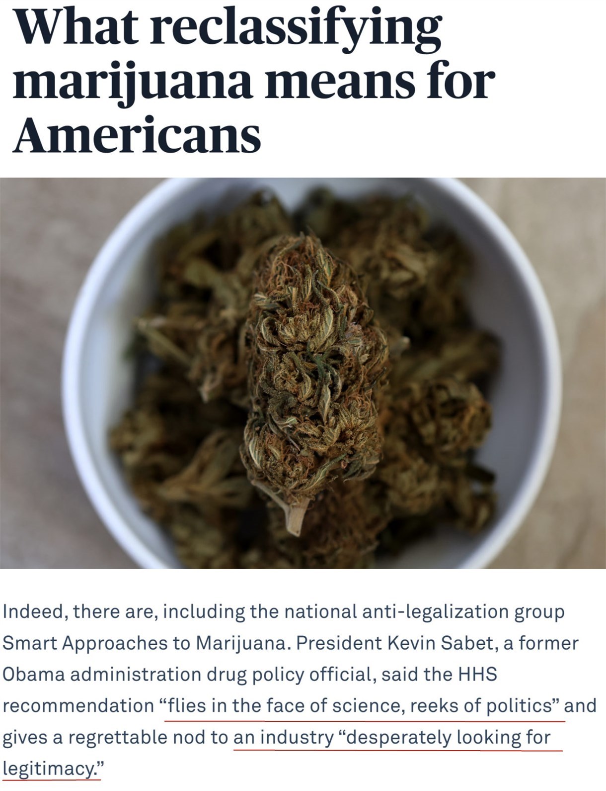 前白宮毒品政策官員凱文·薩比特批評稱,此舉“公然藐視科學,帶有政治意味”,等于是承認了一個“拼命尋求合法性”的行業。