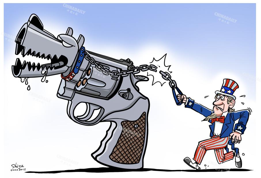 美國槍支如同“惡犬”,脫離掌控害人害己。(作者:中國日報 石宇)