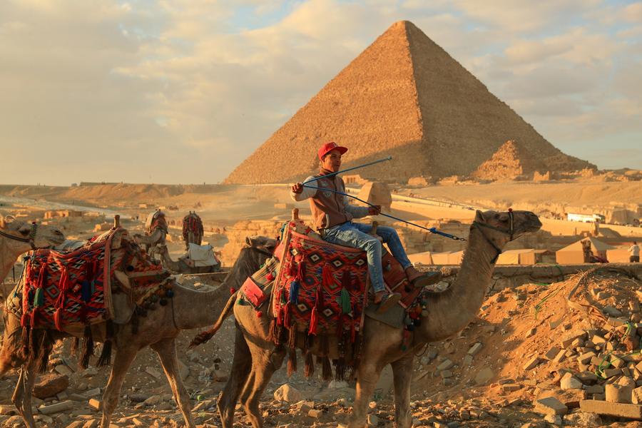 1月24日,商販騎駱駝離開埃及吉薩金字塔景區。新華社記者 隋先凱 攝
