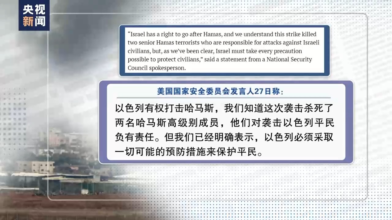 美國國家安全委員會發言人27日稱:以色列有權打擊哈馬斯,我們知道這次襲擊殺死了兩名哈馬斯高級別成員,他們對襲擊以色列平民負有責任。但我們已經明確表示,以色列必須采取一切可能的預防措施來保護平民。