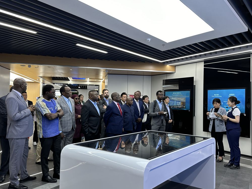 尼日利亞駐上海總領館商務專員穆哈穆德·哈桑一邊聽著介紹,一邊拿出手機展示尼日利亞的一處地形,詢問工程師對橋梁建設的建議以及橋梁養護經驗。