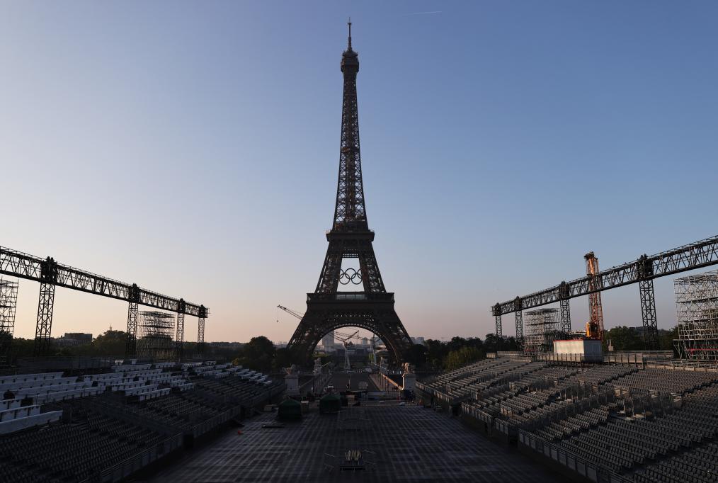 這是6月7日清晨在法國(guó)巴黎拍攝的懸掛奧運(yùn)五環(huán)標(biāo)志的埃菲爾鐵塔以及正在搭建看臺(tái)的特羅卡德羅廣場(chǎng),巴黎奧運(yùn)會(huì)開(kāi)幕式的慶祝活動(dòng)將在這里舉行。 新華社記者高靜攝