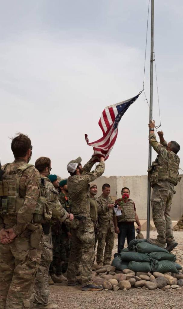 2021年5月2日,美軍士兵在阿富汗赫爾曼德省一處軍事基地降下美國國旗。當日,美軍向阿富汗國民軍移交這處軍事基地。美國和北約軍隊5月1日起正式開始撤離阿富汗,計劃在9月11日前撤完。新華社發(fā)(阿富汗國防部供圖)