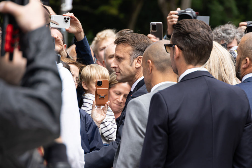 7月7日,在法國勒圖凱,法國總統馬克龍在投票后與民眾交流。新華社發(弗蘭克·博阿姆攝)
