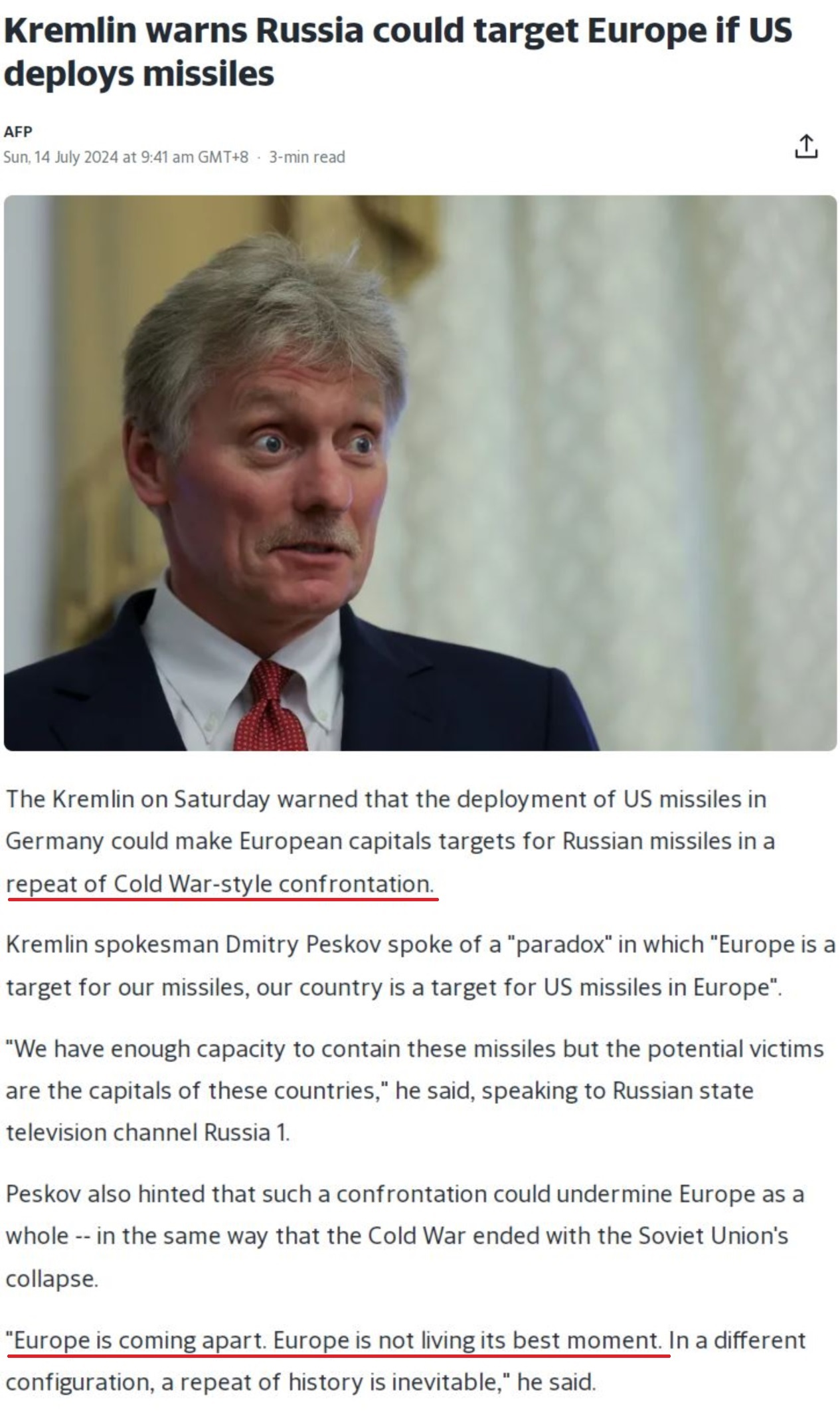 佩斯科夫警告,美國的最新舉動可能會讓歐洲“重演冷戰(zhàn)式對抗”,“歐洲正在分崩離析。對歐洲來說,這絕不是最好的時刻”。