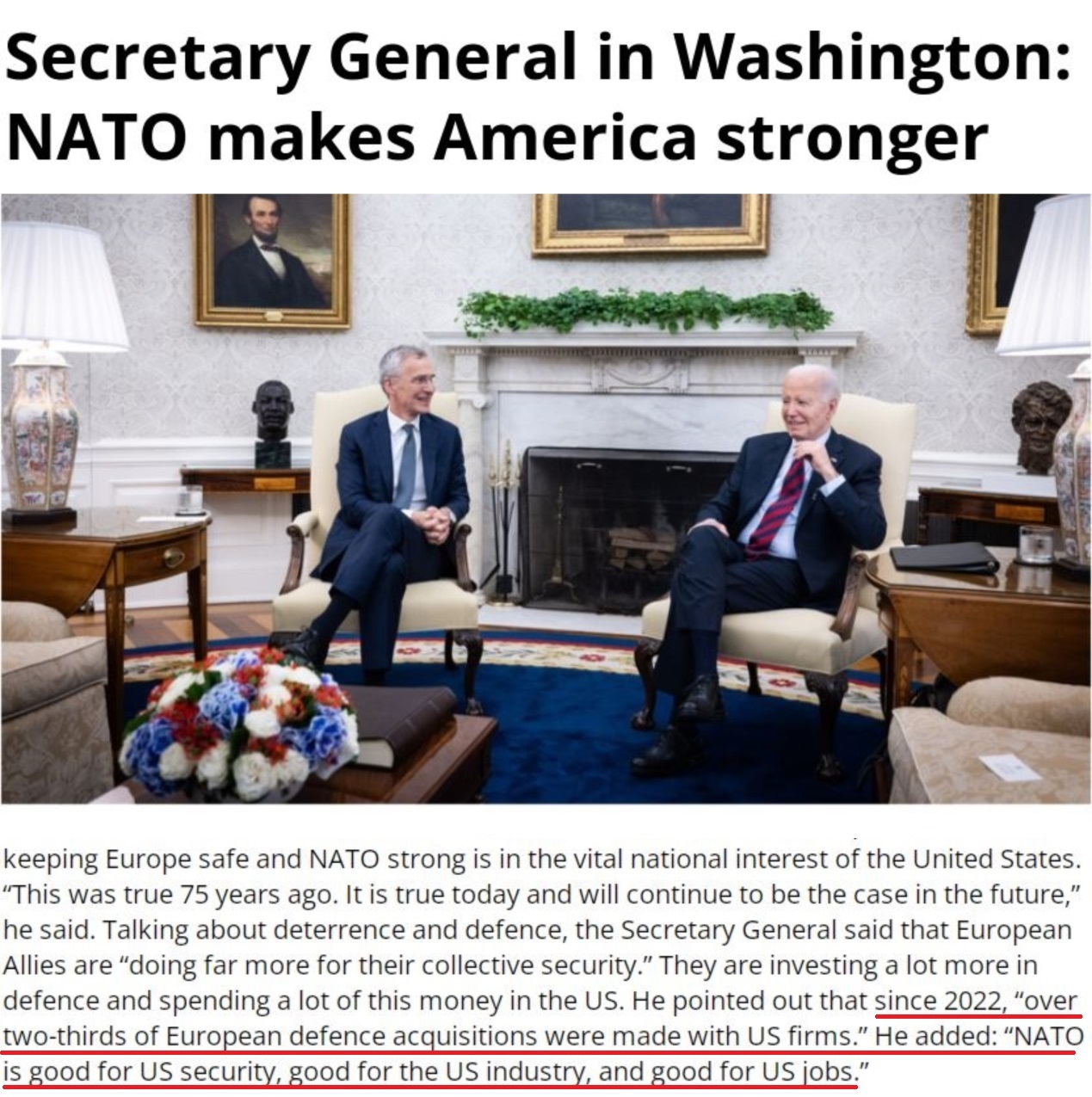 北約官網(wǎng):斯托爾滕貝格告訴美國總統(tǒng)拜登,保持歐洲安全和北約強大符合美國的國家利益,“有利于美國的安全,有利于美國的工業(yè),有利于美國的就業(yè)”。