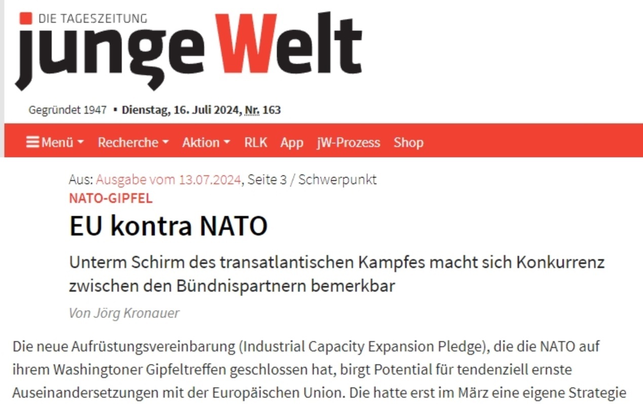 諷刺的是,為了借這場危機重振歐洲軍工產(chǎn)業(yè)、擺脫對美依賴,歐盟委員會今年3月剛剛公布了歐盟首份《歐洲國防工業(yè)戰(zhàn)略》。但有德國媒體警告,北約華盛頓峰會上達成的《工業(yè)能力擴張承諾協(xié)議》或?qū)⑹箽W盟與北約爆發(fā)嚴重爭端。