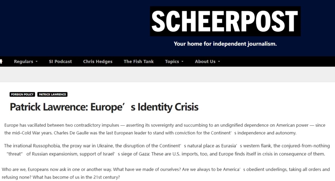 美國資深媒體人兼作家帕特里克·勞倫斯此前發(fā)文指出,自冷戰(zhàn)中期以來,歐洲始終在“維護自身主權(quán)”和“對美國實力的無尊嚴依賴”這對矛盾之間搖擺不定。而美國重新把矛頭對準俄羅斯后,更是在歐洲引發(fā)了嚴重的身份危機。