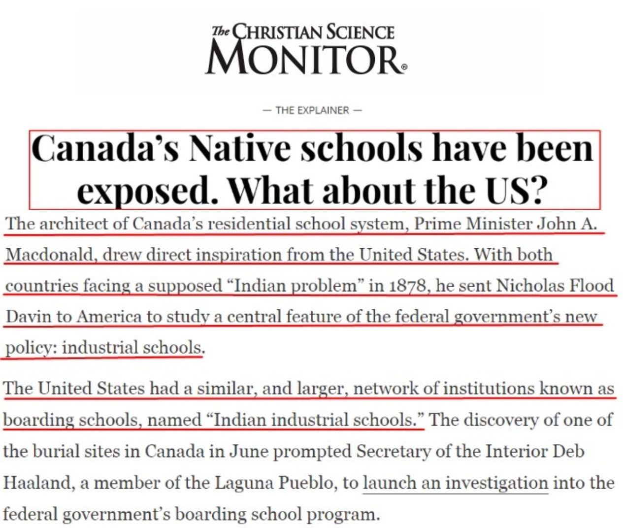 美國《基督教科學箴言報》曾發(fā)文揭露,加拿大原住民寄宿學校系統(tǒng)的所謂“靈感”本就來自美國。從1819年的所謂“印第安人文明開化法案”開始,美國便實施了一系列旨在“同化印第安人”的法律政策,在全國范圍設(shè)立或資助寄宿學校,強行安排印第安兒童入學。