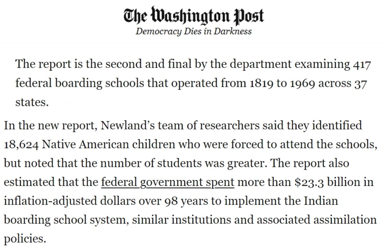 根據(jù)7月30日發(fā)布的調(diào)查報告,美國政府在這項綜合同化項目上花費了相當于今天的250億美元,其中包括在37個州和地區(qū)運營417所寄宿學校,這些學校的兒童受到身體和性虐待。他們還被迫改信基督教,并因說母語而受到懲罰。