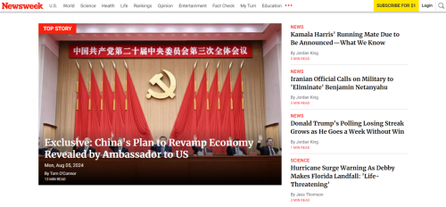 2024年8月2日,駐美國大使謝鋒接受美國《新聞周刊》(Newsweek)高級外交政策記者湯姆·奧康納專訪,闡釋中國共產黨二十屆三中全會精神。訪談內容8月5日在該周刊網站頭版頭條刊登。主要內容如下: