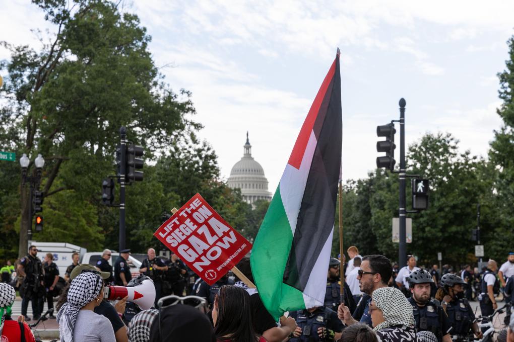 7月24日,以色列總理內塔尼亞胡在美國國會發表演講,數以千計的抗議者在國會大廈外對此表示抵制。圖為抗議者在美國國會附近的聯合車站聚集。新華社記者胡友松攝