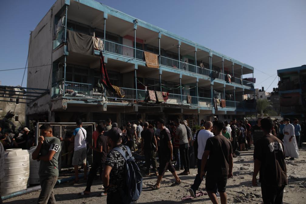 9月11日,在加沙地帶中部努賽賴特難民營,人們聚集在以軍轟炸后的學校廢墟附近。新華社發(馬爾萬·達烏德攝)