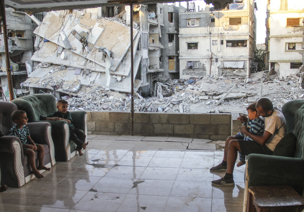 10月6日,在加沙地帶北部杰巴利耶,人們坐在建筑廢墟附近。新華社發(馬哈茂德·扎基攝)