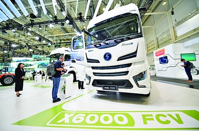 9月16日,在德國漢諾威國際交通運輸博覽會媒體預展上,參觀者在陜汽控股展區了解一款氫燃料電池牽引車。新華社發