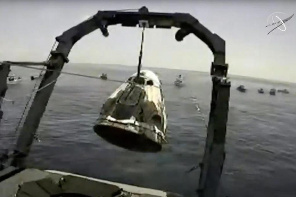 這張美國航天局2020年8月2日發布的視頻截圖顯示,回收船在美國東南部佛羅里達州附近的墨西哥灣打撈太空探索技術公司“龍”飛船。新華社發(美國航天局供圖)
