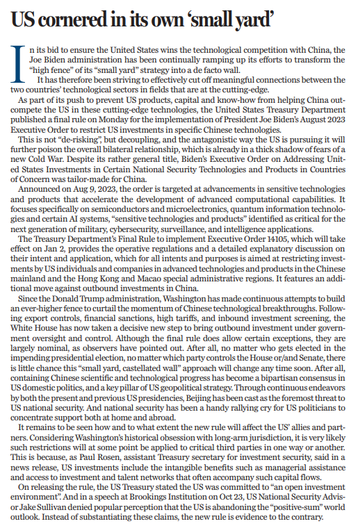 自特朗普政府以來,美國不斷把“小院”的“高墻”越筑越高,意圖遏制中國科技發展勢頭。繼出口管制、金融制裁、高額關稅、對內投資審查之后,美國政府進一步果斷采取行動,將美國對外投資納入監管和控制之下。最終規則雖然允許某些例外,但正如觀察人士所言,這也只不過是名義上的。畢竟,無論誰在即將到來的總統大選中勝出,無論參議院和眾議院被哪個黨派控制,美國都不太可能短期內改變對華采取 “小院城墻”的政策;畢竟,遏制中國科技進步已成為美國兩黨共識,也成為美國地緣政治策略的重要組成部分。在美國歷屆政府的努力下,中國被塑造成美國國家安全的頭號威脅。對美國政客來說,國家安全儼然成為獲取國內外支持的便捷手段。
