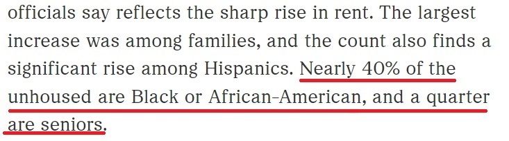 根據美國全國公共廣播電臺2023年報道中提及的數據,近40%的無家可歸者是非洲裔美國人,25%的無家可歸者是老年人,而拉丁裔無家可歸者的增幅則在近年大幅提升。