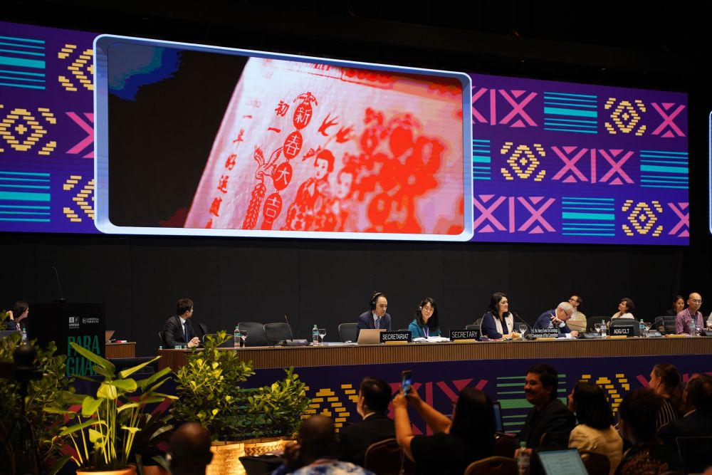 12月4日,在巴拉圭亞松森聯合國教科文組織保護非物質文化遺產政府間委員會第19屆常會評審現場,大屏幕播放春節宣傳視頻。新華社記者朱雨博攝