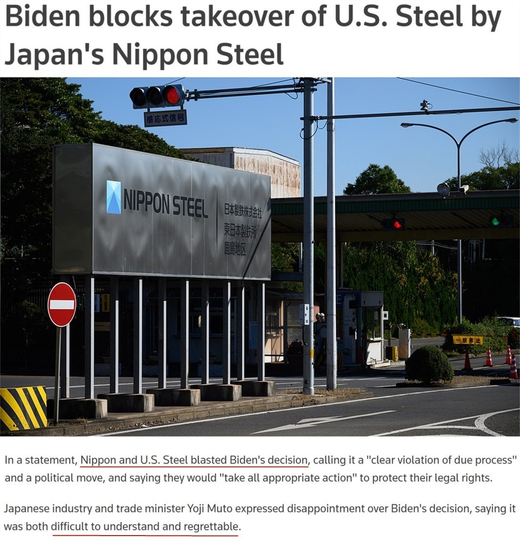 雖然日鐵多次讓步,但美國總統拜登當地時間3日發表聲明,正式阻止了這筆價值2萬億日元(按目前匯率約合127億美元)的交易。