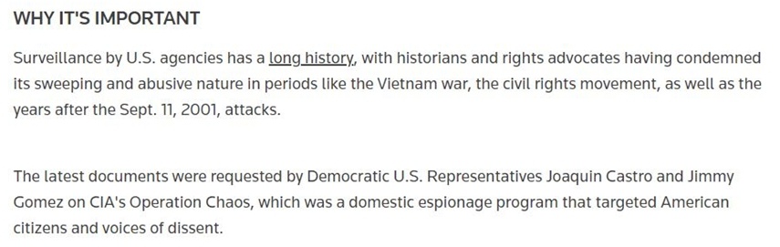 報(bào)道稱,這些文件是在兩名國會(huì)眾議員的反復(fù)要求下,才于上月底公布的,讓人們得以一窺美國政府和中情局是如何將民權(quán)活動(dòng)視為威脅的。