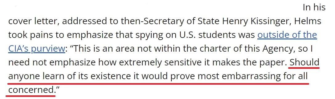 就像時(shí)任中情局局長赫爾姆斯1970年在寫給時(shí)任國務(wù)卿基辛格的信中所說,監(jiān)視美國學(xué)生不在中情局的職權(quán)范圍內(nèi),“如果有人知道了‘混沌行動(dòng)’的存在,對(duì)所有相關(guān)者來說都將是非常尷尬的事情”。