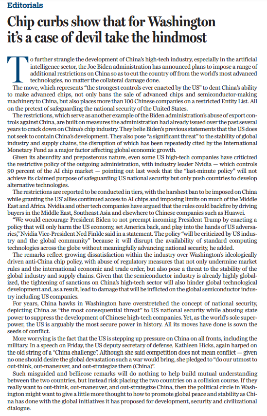 此前,美國高科技企業(yè)、行業(yè)組織等通過多種渠道表達不滿和擔憂,認為該措施未經(jīng)充分討論、制定出臺草率,是對人工智能領域的過度監(jiān)管,將產(chǎn)生重大不利后果,強烈呼吁拜登政府停止出臺。美國芯片巨頭英偉達坦言,拜登政府這一“最后時刻出臺的政策”不僅無法實現(xiàn)所謂保護美國國家安全的目標,反而會促使其他國家加速開發(fā)替代技術。
