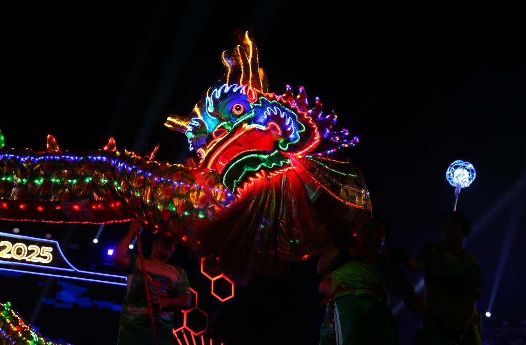 1月26日,演員在泰國那空沙旺湄南河畔舉行的春節慶?;顒由媳硌菸椠垺P氯A社記者孫瑋彤攝