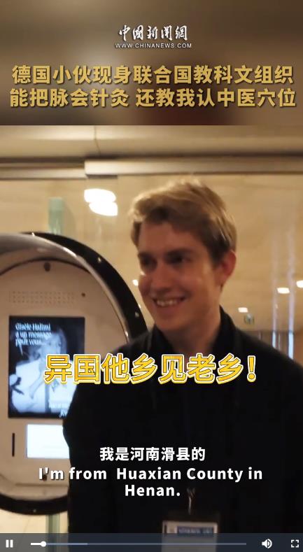 由中國常駐聯合國教科文組織代表團與河南衛視共同舉辦的“我們的春節”慶祝活動當地時間6日晚在位于法國巴黎的聯合國教科文組織總部華美亮相。活動現場,記者遇到德國小伙推介中醫文化。這位名叫“無名”的德國小伙,早已憑借地道的河南話和對中醫的熱愛多次爆火出圈。在法國巴黎聯合國教科文組織總部,參與“我們的春節”活動之余,無名還開啟了中醫小課堂。(王高飛)