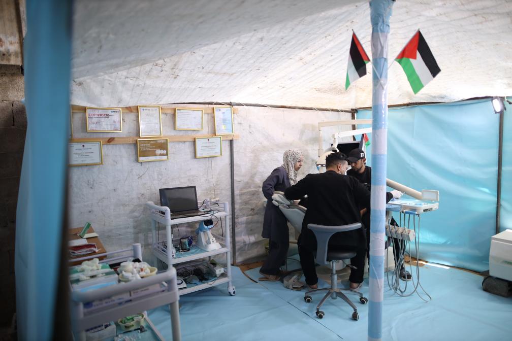 2024年3月30日,在加沙地帶的一家臨時診所,牙科醫生為患者看病。新華社發