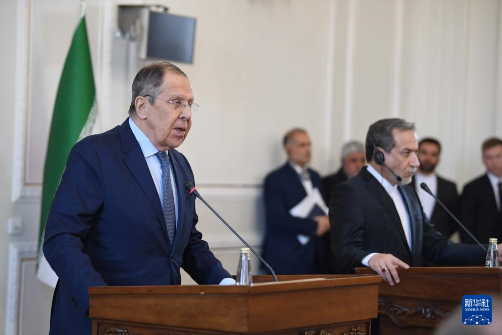 2月25日,在伊朗德黑蘭,俄羅斯外長拉夫羅夫(左)與伊朗外交部長阿拉格齊出席聯合新聞發布會。新華社記者 沙達提 攝